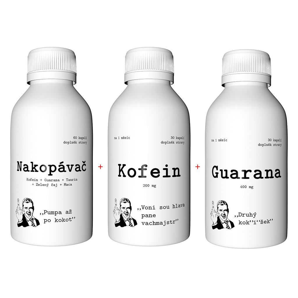 Složení: Kombinace tří samostatných doplňků stravy nakopávač, kofein, guarana.